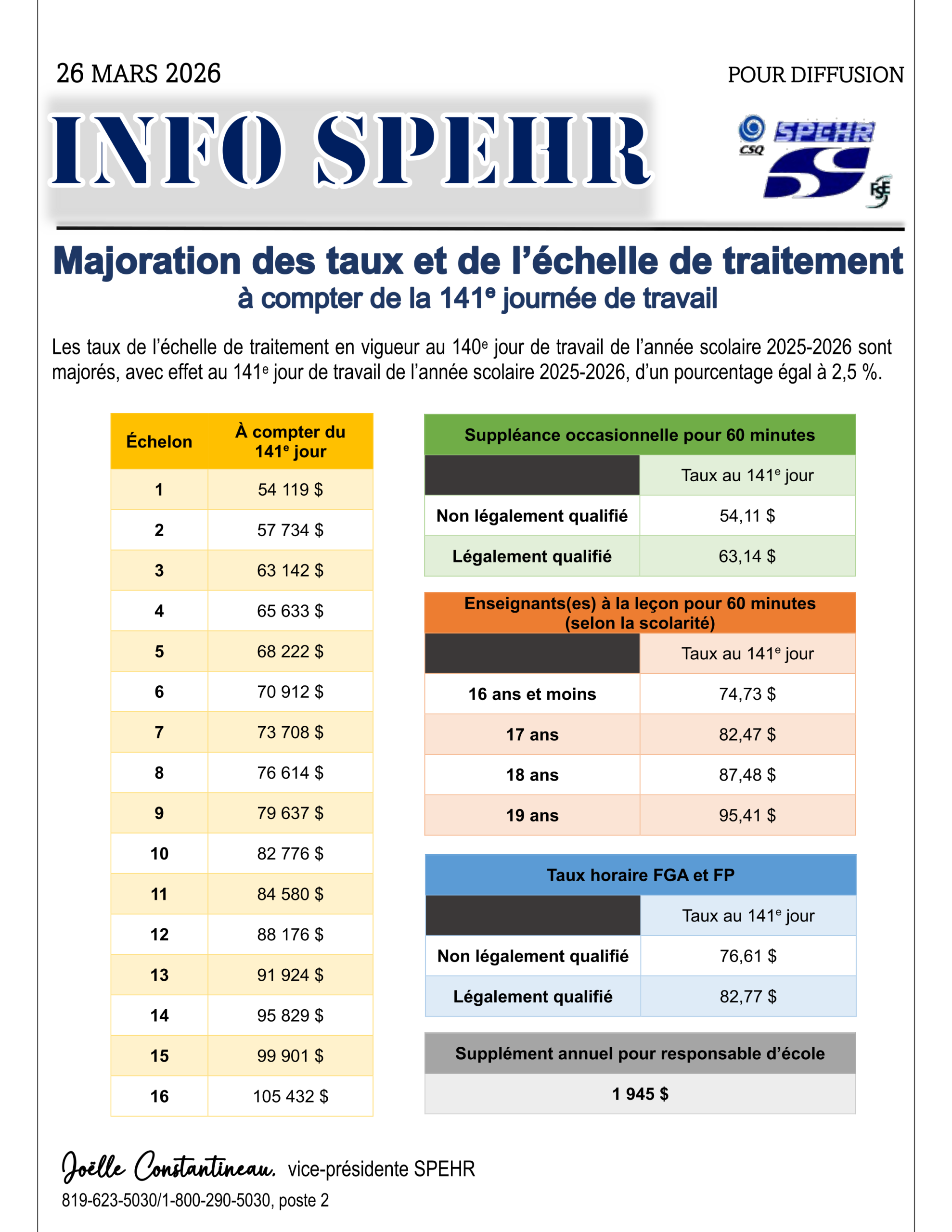 Échelles à compter de la 141e journée de travail de 2025-2026